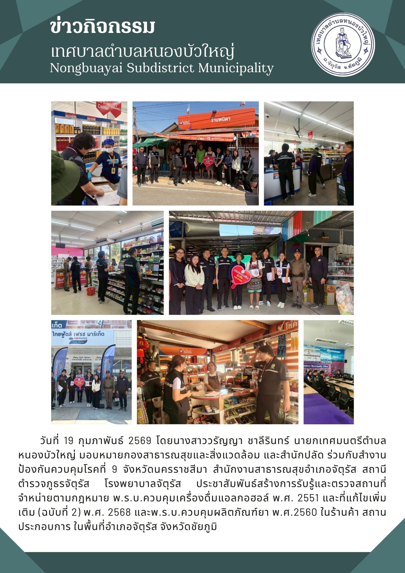 วันที่ 19 กุมภาพันธ์ 2569 โดยนางสาววรัญญา ชาลีรินทร์ นายกเทศมนตรีตำบลหนองบัวใหญ่ มอบหมายกองสาธารณสุขและสิ่งแวดล้อม และสำนักปลัด ร่วมกับสำงานป้องกันควบคุมโรคที่ 9 จังหวัดนครราชสีมา สำนักงานสาธารณสุขอำเภอจัตุรัส สถานีตำรวจภูธรจัตุรัส โรงพยาบาลจัตุรัส ประชาสัมพันธ์สร้างการรับรู้และตรวจสถานที่จำหน่ายตามกฎหมาย พ.ร.บ.ควบคุมเครื่องดื่มแอลกอฮอล์ พ.ศ. 2551 และที่แก้ไขเพิ่มเติม (ฉบับที่ 2) พ.ศ. 2568 และพ.ร.บ.ควบคุมผลิตภัณฑ์ยา พ.ศ.2560 ในร้านค้า สถานประกอบการ ในพื้นที่อำเภอจัตุรัส จังหวัดชัยภูมิ